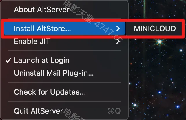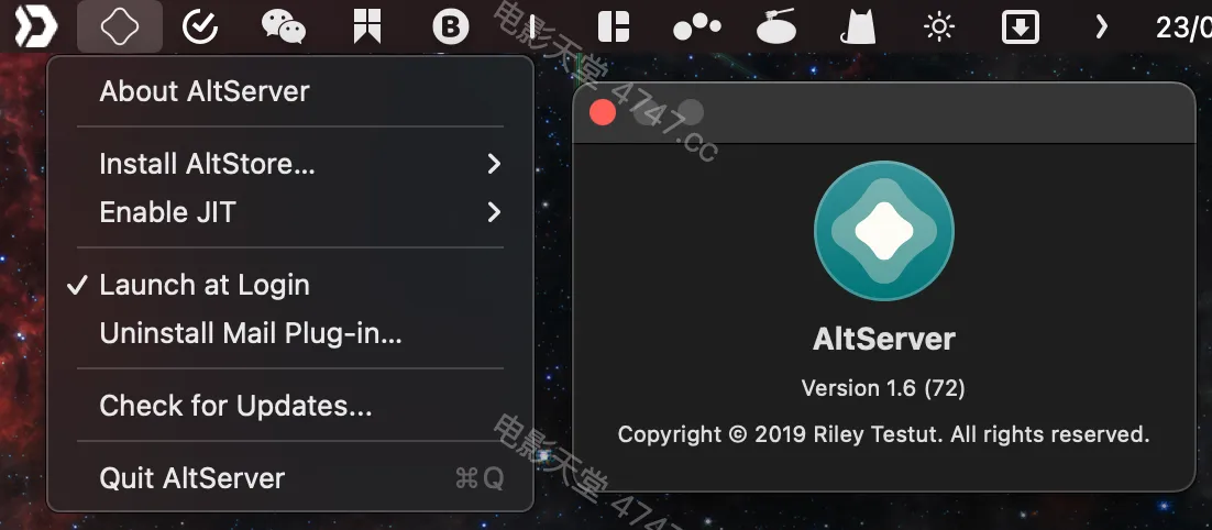 下载安装完成后,AltServer 没有应用程序主界面,在电脑右上角的状态栏,能找到一个小小的图标。