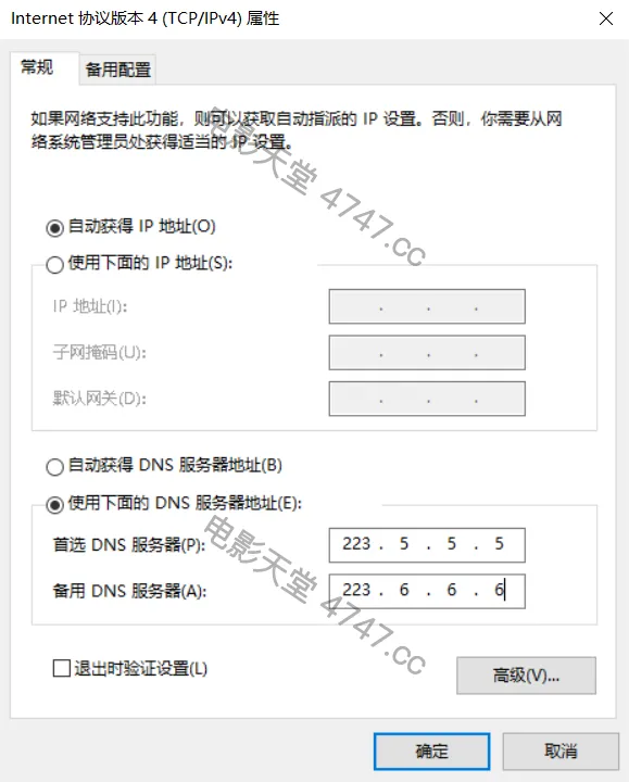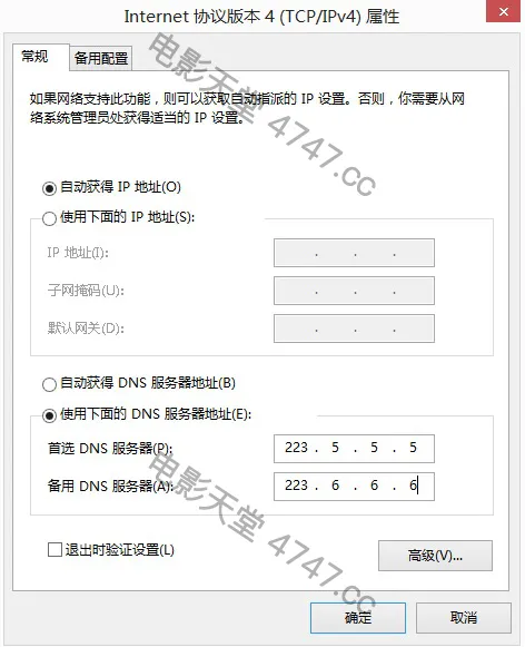 4.单击“使用下面的 DNS 服务器地址”,然后在“首选 DNS 服务器”和“备用 DNS 服务器”框中,键入主 DNS 服务器和辅助 DNS 服务器的地址。