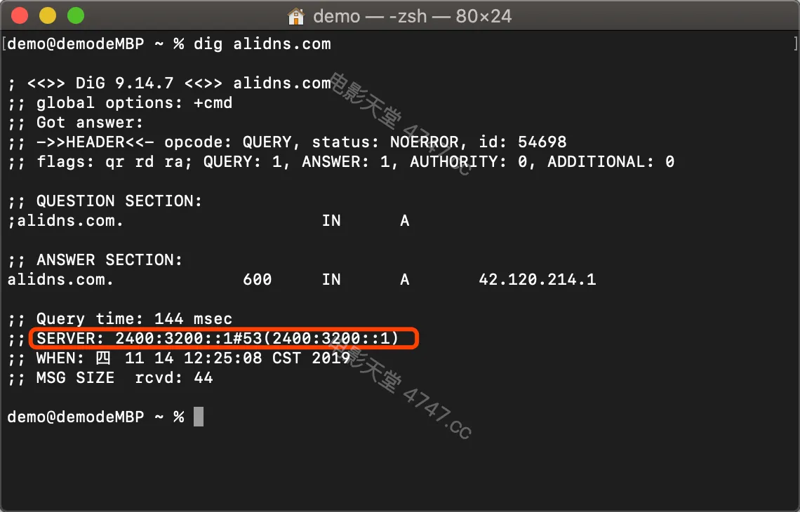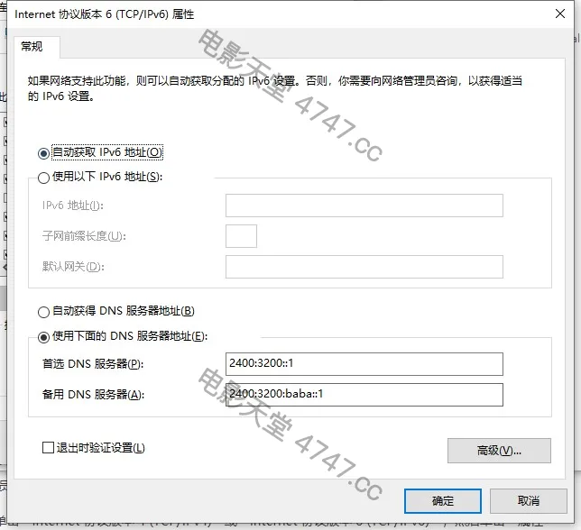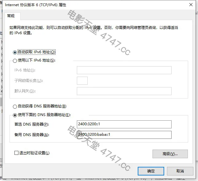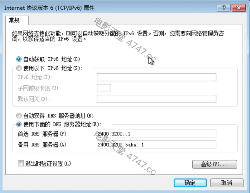 若返回结果的server为阿里公共DNS(2400:3200::1或2400:3200:baba::1)则配置成功。