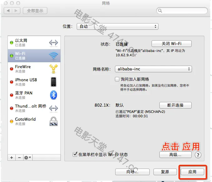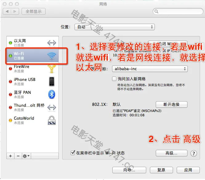 3.从列表中选择想要使用的网络连接服务(例如WIFI或以太网),然后点按“高级”