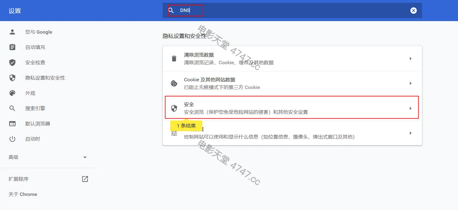 第二步:在搜索框中输入“DNS”,在下方的检索结果中,点击【安全】右侧的展开箭头。