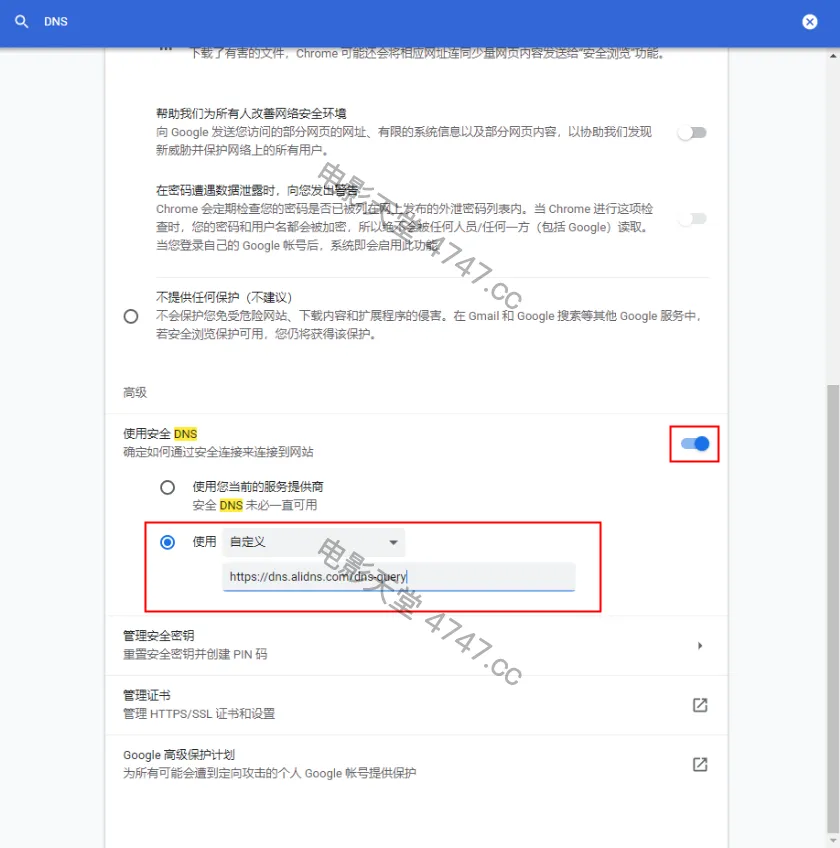 第三步:页面下拉到最下方,在【高级】选项中,开通“使用安全DNS”功能,并在【使用】-【自定义】框中输入“ https://dns.alidns.com/dns-query ”即可完成配置。