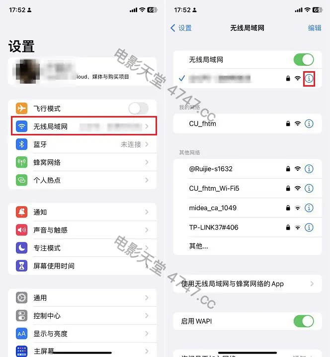 1、依次进入 iPhone的 「设置」->「无线局域网」,点击已连接的WiFi网络后面的 「i」图标进入网络设置,如图所示。