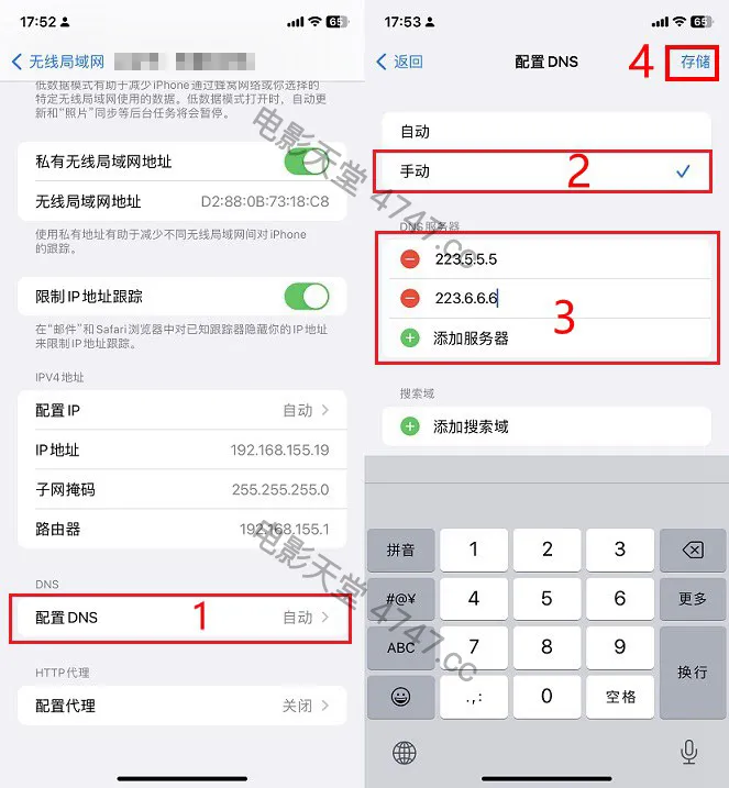 2、在已连接的WiFi网络设置的下方找到并点击 「配置DNS」。iPhone中的DNS默认是自动获取的,如需修改点击切换到 「手动」选项就可以了。切换到手动选项后,在下方的DNS服务器选项中,就可以添加手动的DNS地址了,如图所示。